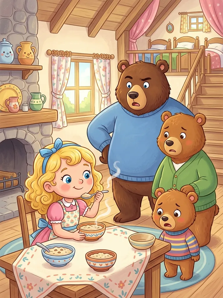 Goldilocks and the Three Bears is a classic fairy tale about a young, mischievous girl (referred to as a 'little old Woman' in this version) who stumbles upon an empty cottage belonging to a family of bears. Driven by curiosity and a lack of manners, she helps herself to their porridge, tries out their chairs, and eventually falls asleep in the smallest bear's bed. When the Three Bears—a Great, Huge Bear; a Middle Bear; and a Little, Small, Wee Bear—return home, they discover the series of intrusions. Their escalating surprise and distress culminate in the Little, Small, Wee Bear's discovery of the sleeping intruder, leading to her swift and unceremonious flight. The story serves as a cautionary tale about respecting private property and the consequences of uninvited entry.