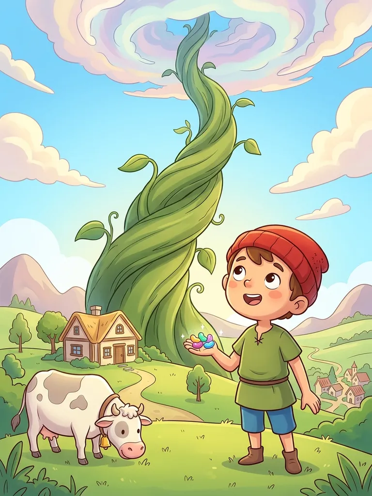 Jack and the Beanstalk is a classic English fairy tale that tells the story of a young, impoverished boy named Jack who lives with his widowed mother. When their last cow, Milky-white, stops giving milk, Jack is sent to market to sell her. Instead of selling her for money, he trades her for five magical beans from a mysterious old man. His mother, furious, throws the beans out the window. Overnight, a giant beanstalk grows to the sky, leading Jack to a land above the clouds inhabited by a fearsome Ogre and his wife. Jack embarks on a series of daring thefts, acquiring bags of gold, a hen that lays golden eggs, and a magical harp, all while narrowly escaping the Ogre's clutches. The tale culminates in a dramatic confrontation where Jack fells the beanstalk, defeating the Ogre and securing a prosperous future for himself and his mother.