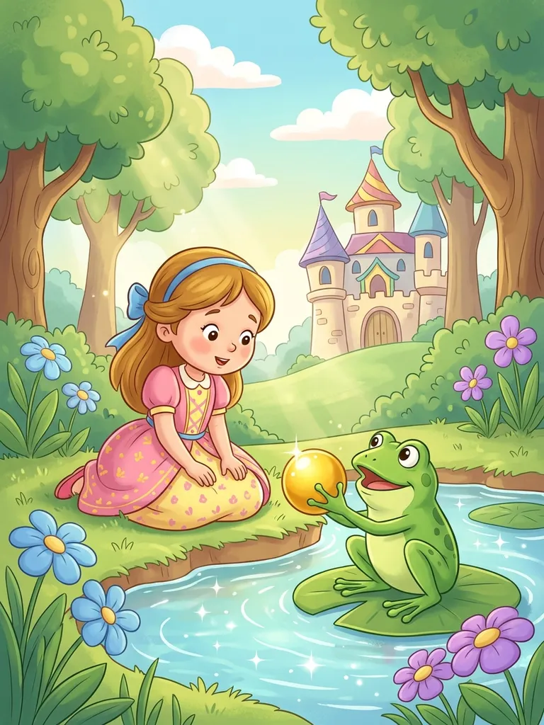 A classic fairy tale about a spoiled princess who loses her golden ball in a spring. A talking frog offers to retrieve it in exchange for her friendship, including eating from her plate and sleeping in her bed. Reluctantly, and initially deceitfully, the princess agrees. When the frog appears at her castle door, her father, the King, insists she honor her promise. After three nights of sharing her bed, the frog transforms into a handsome prince, revealing he was under a wicked spell. The prince and princess then marry and live happily ever after. The story explores themes of promises, transformation, and inner beauty.